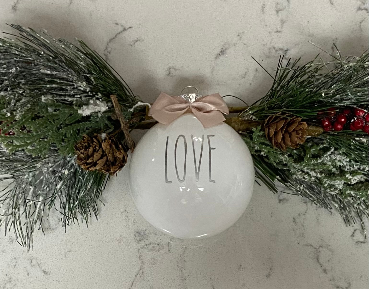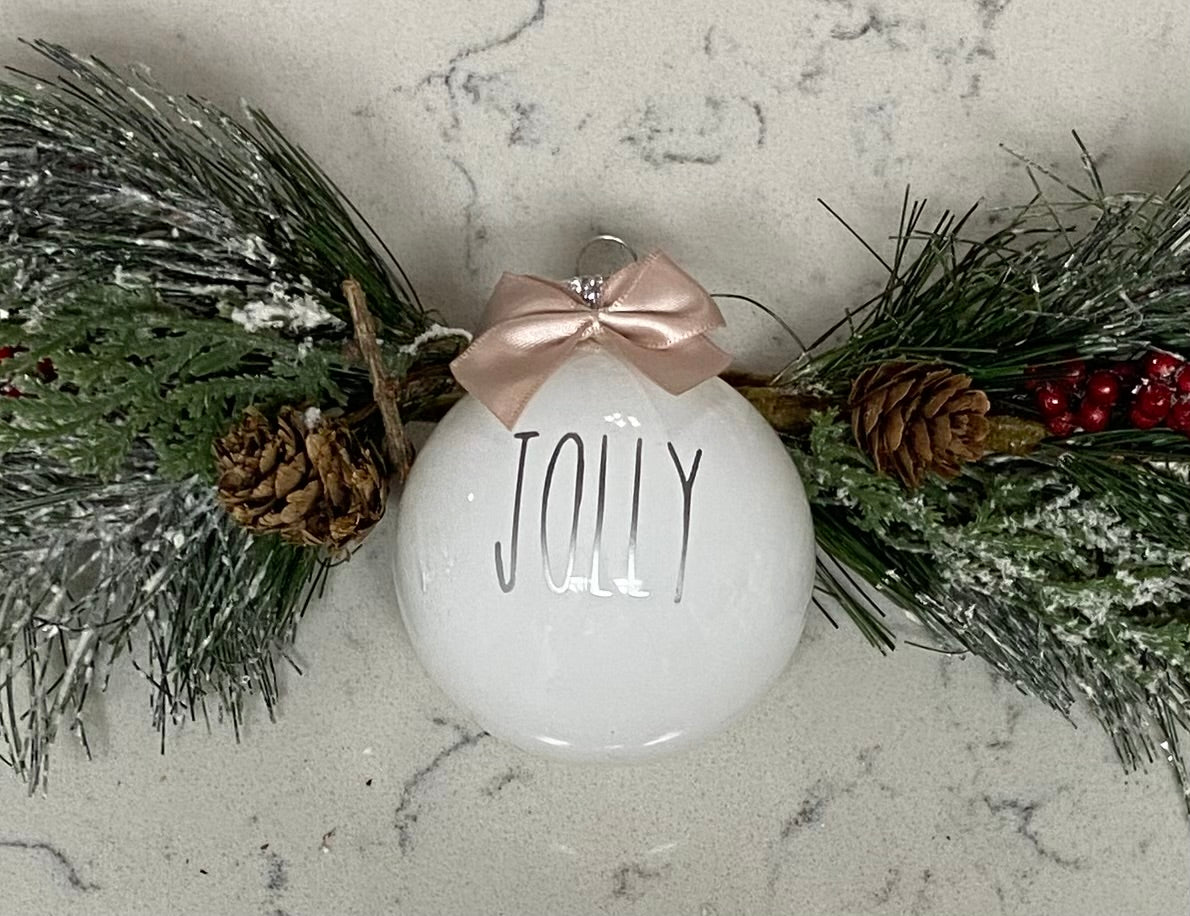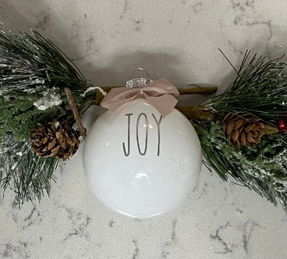Rae Dunn/Farmhouse inspired ornaments will make the perfect addition to your tree or as a gift for a loved one. These ornaments are accented with a fabric bow and vinyl words. The ornament in this listing is approximately 3 inches in diameter.