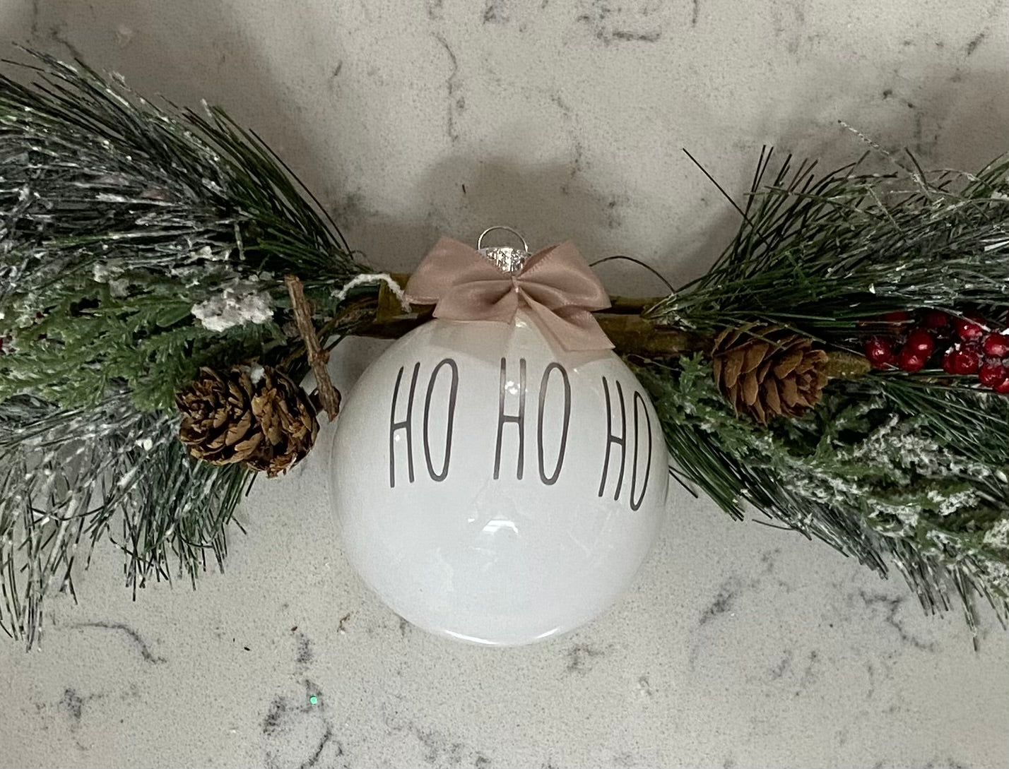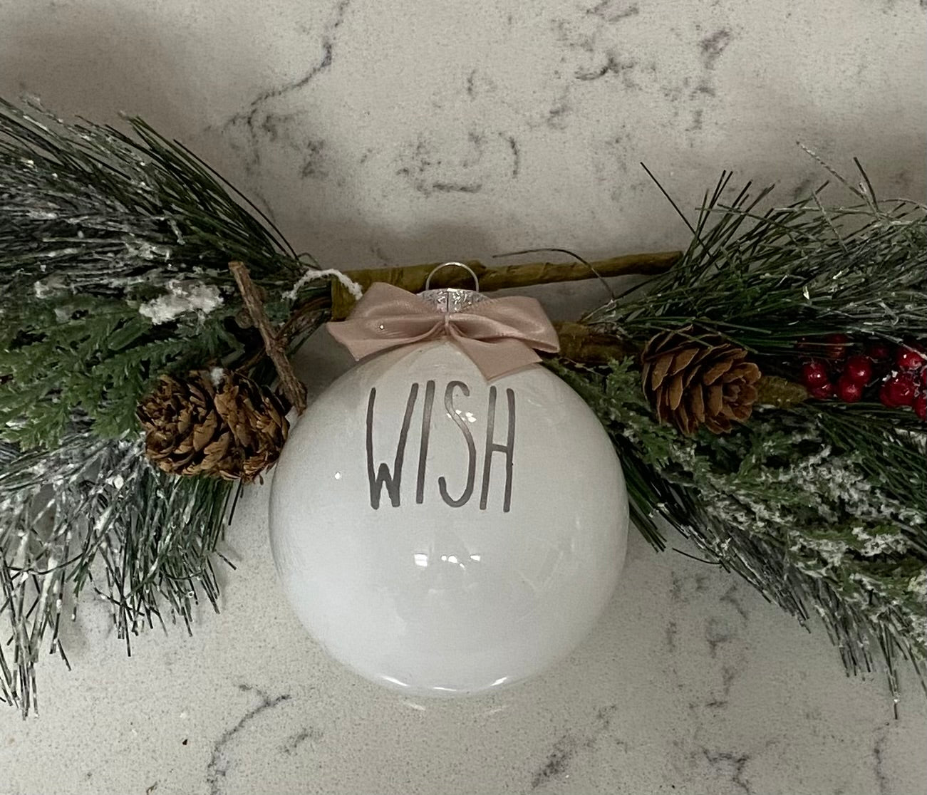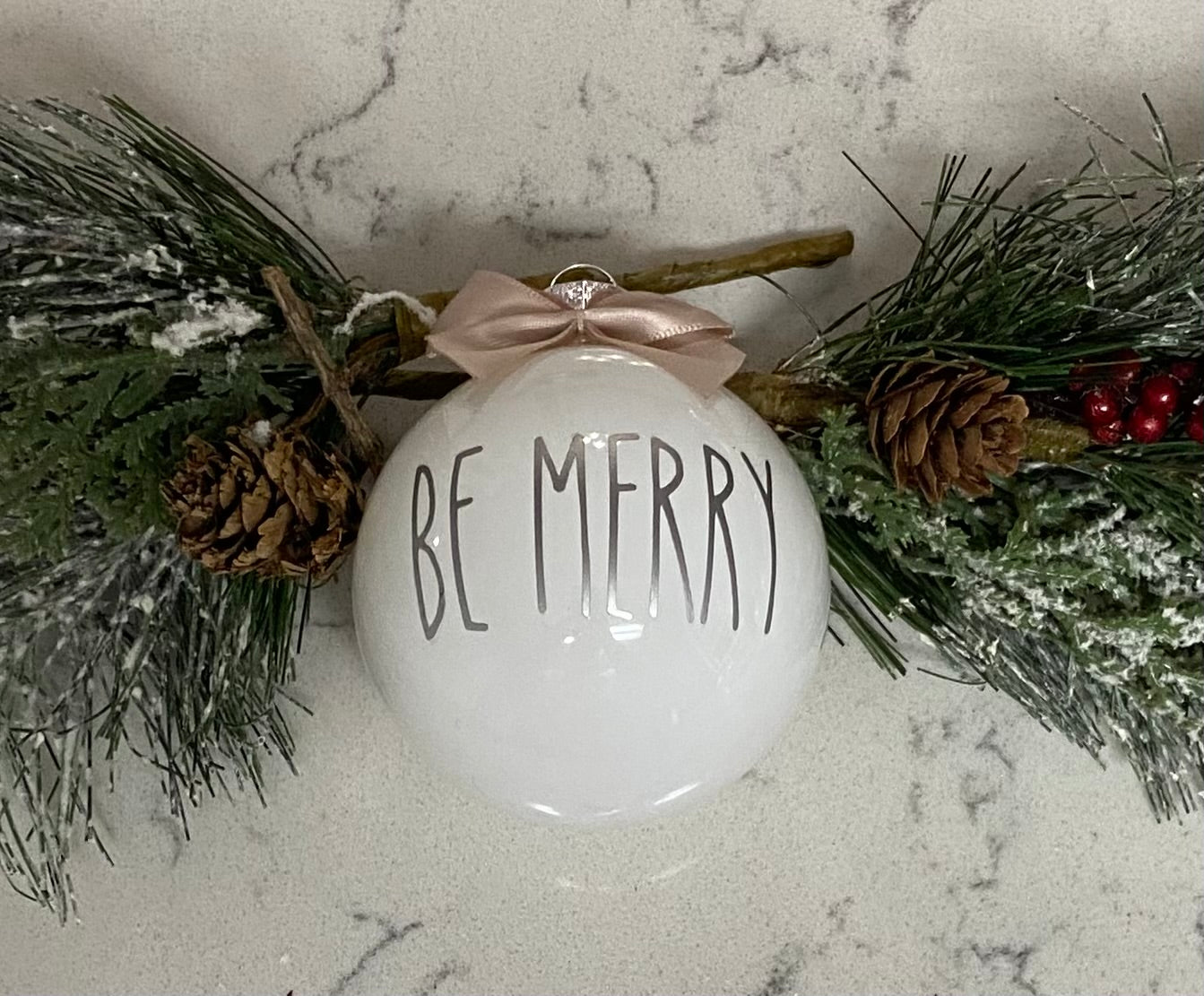 Rae Dunn/Farmhouse inspired ornaments will make the perfect addition to your tree or as a gift for a loved one. These ornaments are accented with a fabric bow and vinyl words. The ornament in this listing is approximately 3 inches in diameter.